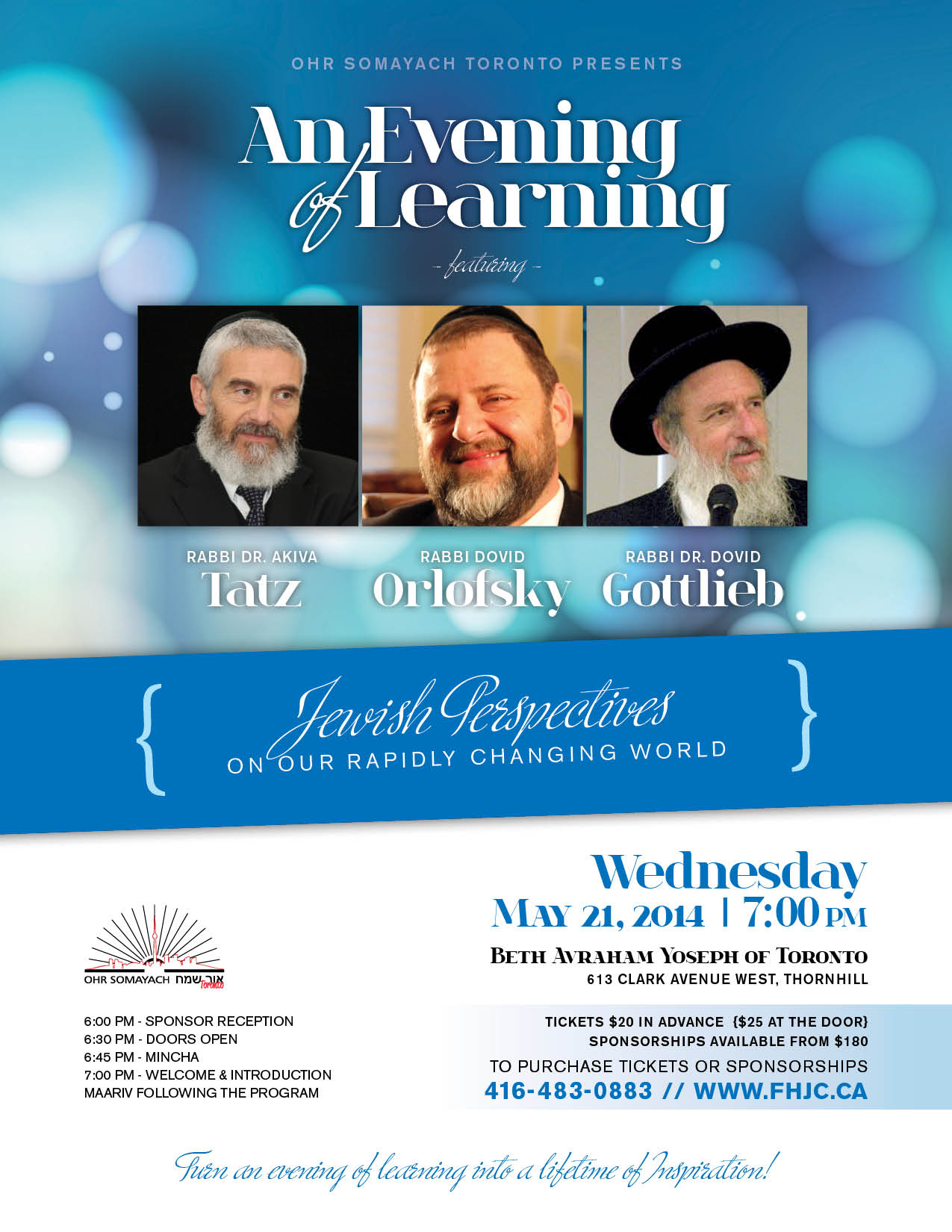 | Ohr Somayach Toronto/R. Tatz & R Orlofsky & Rabbi Gottlieb, 21 May 2014 7:00 - 9:00 pm |